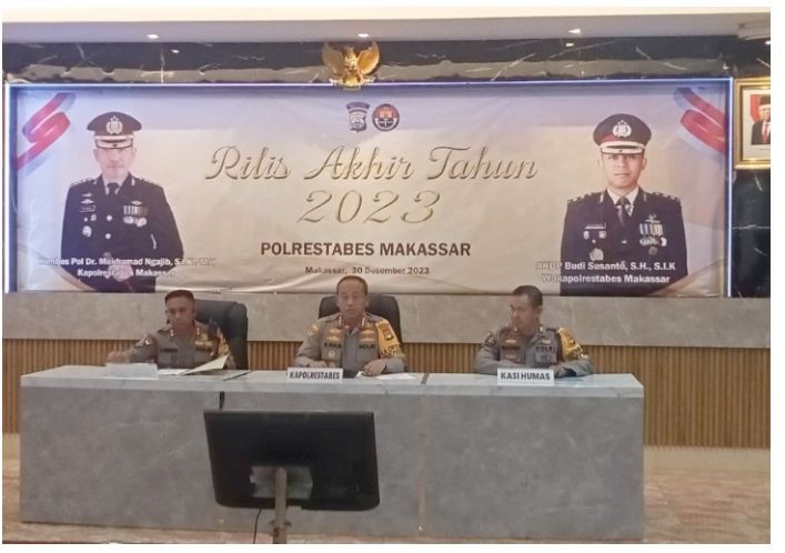 News Lintas Sulawesi/Polrestabes MakasMakassar (Sulsel) : Pada Sabtu (30/12/2023), Kepala Kepolisian Polrestabes Makassar Polda Sulsel, Kombes Pol Mokhamad Ngajib S.IK., M.H., didampingi Waka Polrestabes AKBP Budi Susanto, S.H., S.I.K., dan Kasi Humas AKP Wahiduddin, merilis perkembangan situasi dan kinerja Polrestabes Makassar selama tahun 2023. Acara tersebut juga dihadiri oleh Pejabat Utama Polrestabes Makassar.