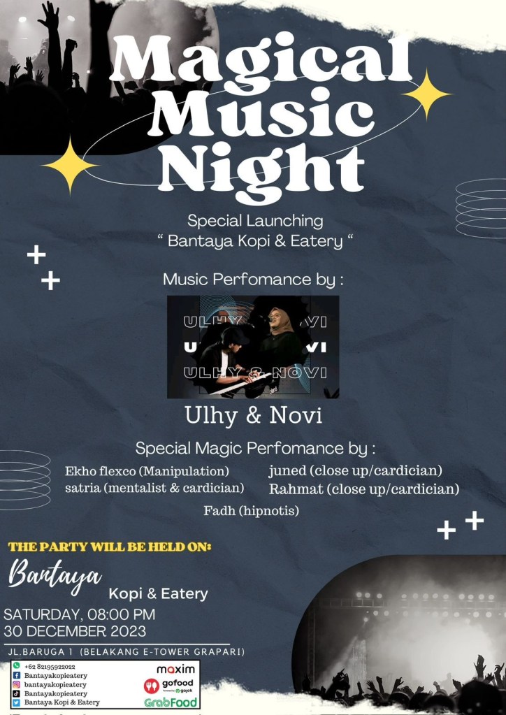 2. “Magical Music Night”, Sabtu malam ini, 30-12-2023, jam 20.00 Wita sd selesai: Di BANTAYA Kopi & Eatery, Jl. Baruga No.2 (Belakang E-Tower Grapari Palu).