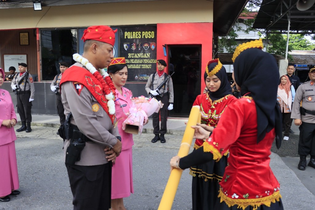 Kapolres Poso yang baru, AKBP Arthur Sameaputty, SIK, tiba di Mako Polres Poso disambut dengan tarian adat dan pengalungan bunga oleh para Bhayangkari yang hadir. Suasana hangat semakin terasa ketika Ny. Agnes Arthur, Ketua Bhayangkari Cabang Poso, ikut serta dalam menyambut suaminya yang baru menjabat sebagai Kapolres.