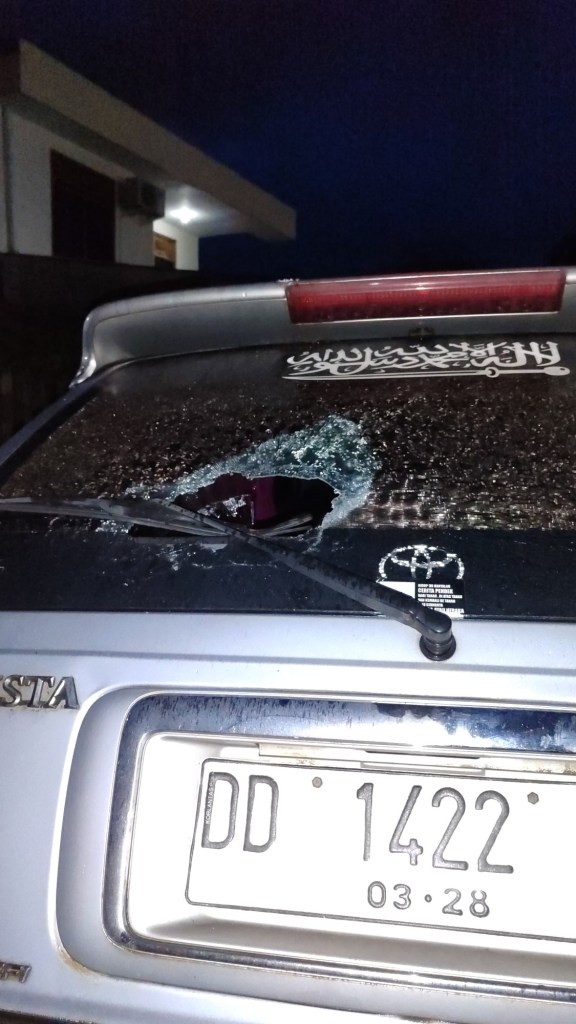 Taksiran kerugian Rp 5 juta, kaca depan dan belakang rusak”, katanya.