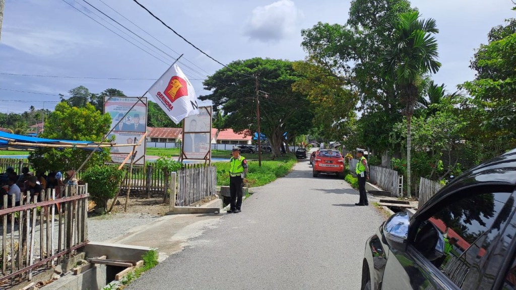 News Lintas Sulawesi/Poso : Personil Satuan Tugas (Satgas) Kamseltibcar Lantas melaksanakan tugas pengamanan, pengaturan, dan penjagaan arus lalu lintas di Desa Tagolu, Kecamatan Lage, Kabupaten Poso. Kegiatan ini dilaksanakan dalam rangka kampanye tatap muka oleh calon legislatif (caleg) DPRD Kabupaten dari Partai Gerindra di rumah Bapak Marhen Ralampi. Senin(15/01/2024).