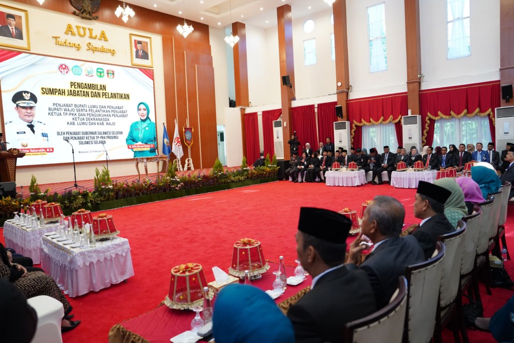 Pengambilan Sumpah Jabatan dan Pelantikan Pejabat Bupati Luwu Muh. Saleh dan Bupati Wajo Andi Bataralifu ini dipimpin langsung oleh Pj. Gubernur Sulsel Dr. Bahtiar Baharuddin M.Si., serta dihadiri unsur Pejabat TNI-POLRI dan Forkopimda Kota/Kabupaten.