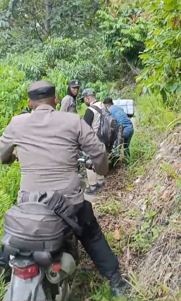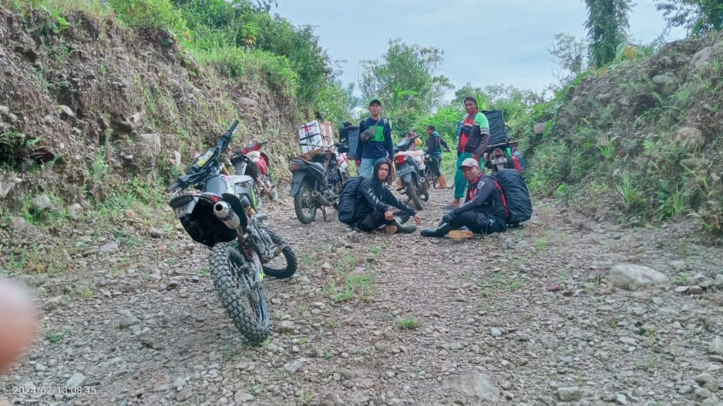 News Lintas Sulawesi Sigi/Sulteng; Sulitnya medan ditempuh hanya dapat dikayuh dengan kenderaan beroda dua motor roda gigi atau motor trail di tempat Pemungutan Suara (TPS) 5 Dusun Manggalapi Desa Rejeki Kecamatan Palolo Kabupaten Sigi. Jum’at (16/2-2024)