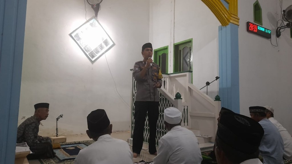 Bripka Jabbar Abu, seorang Da’i Kamtibmas Ops Madagoraya tahap I 2024 melaksanakan sholat Maghrib berjamaah di Mesjid Baitul Quddus Desa Uedele, Kecamatan Tojo, Kabupaten Tojo Una-Una. Setelah sholat Maghrib, Bripka Jabbar Abu menyempatkan diri untuk menyampaikan pesan Kamtibmas kepada jamaah yang hadir. (uedele, 4/3/2024)