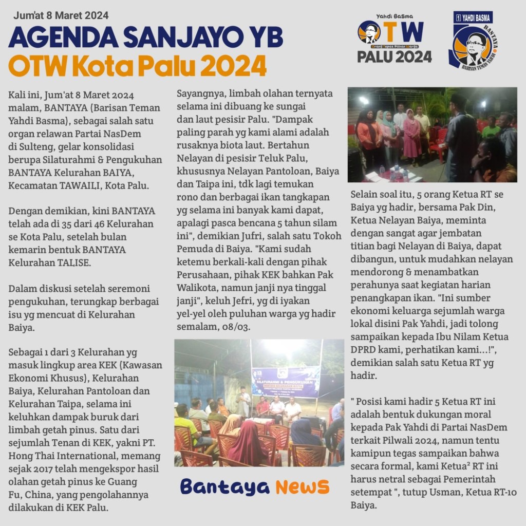 Kali ini, Jum’at malam, BANTAYA (Barisan Teman Yahdi Basma), sebagai salah satu organ relawan Partai NasDem di Sulteng, gelar konsolidasi berupa Silaturahmi & Pengukuhan BANTAYA Kelurahan BAIYA, Kecamatan TAWAILI, Kota Palu.