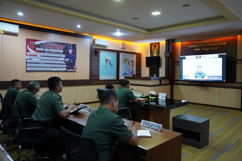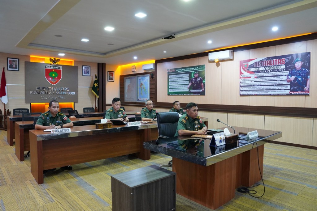 News Lintas Sulawesi/Makassar; Pangdam XIV/Hasanuddin Mayjen TNI Bobby Rinal Makmun, S.I.P., didampingi sejumlah Pejabat Utama (PJU) Kodam mengikuti Video Conference (Vicon) Ketahanan Pangan dalam rangka Mendukung Program Pemerintah dalam Ketahanan Pangan Nasional, bertempat di Ruang Vicon Puskodalops Makodam, Jl. Urip Sumoharjo, Kota Makassar. Kamis, (14/03/2024).