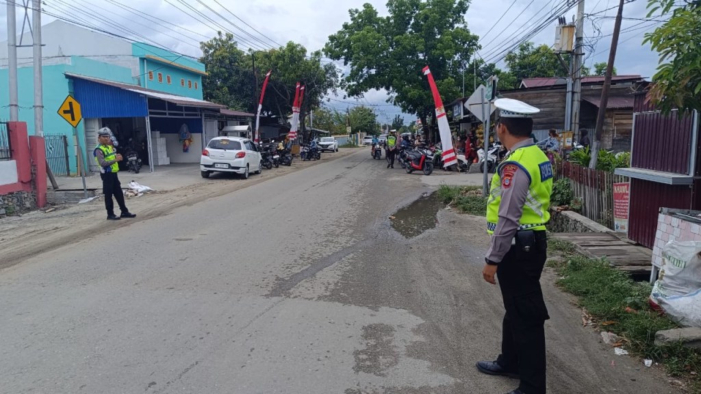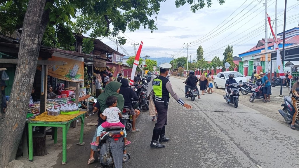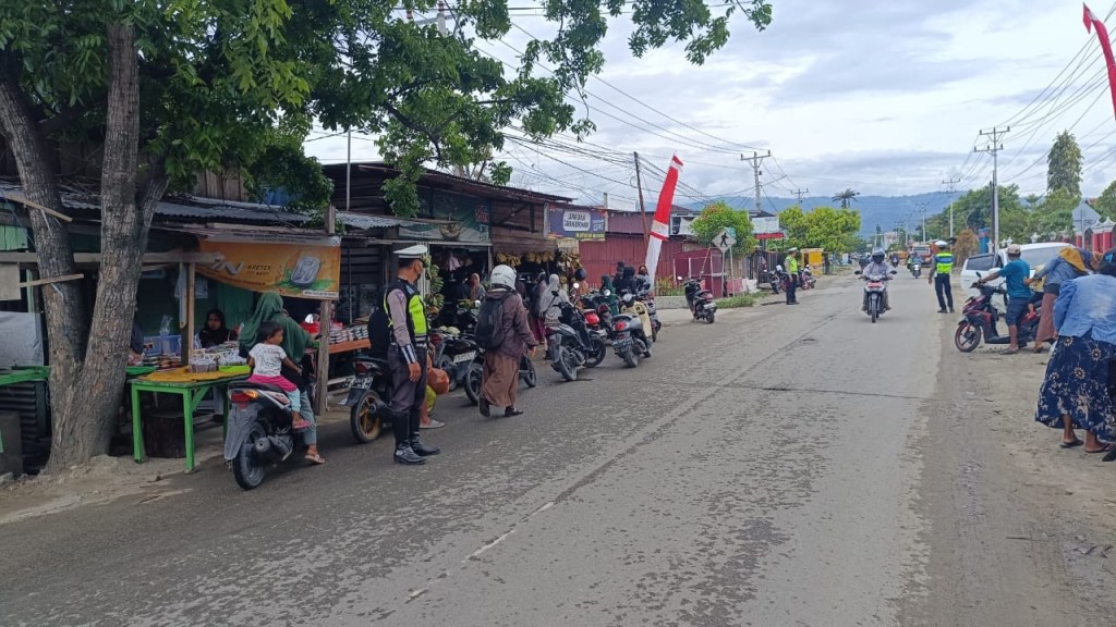 Selain melakukan pengamanan, Personel dari Sat Lantas Polres Sigi yang dipimpin oleh Bripka Putu Mahayana juga melakukan pengaturan arus lalu lintas untuk mengurai kemacetan di pasar tumpah tersebut.