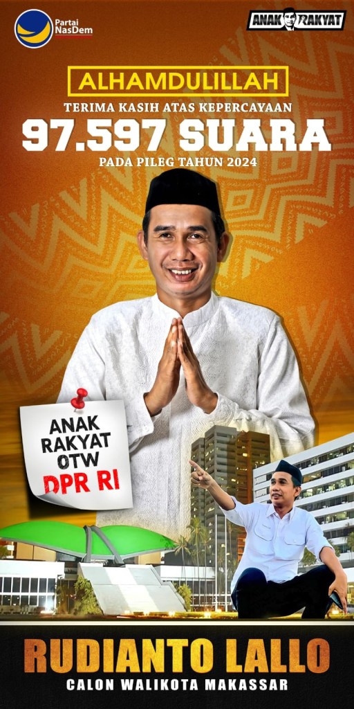 News Lintas Sulawesi/Makassar; Saya mengenal Rudianto Lallo ketika sama sama menjadi caleg kota Makassar Dapil 2 di tahun 2019 meliputi kecamatan Tallo, Ujung Tanah, Bontoala, Wajo dan kepulauan Sangkarrang. Saya Caleg dari Partai Perindo dan RL Caleg dari partai NasDem yang waktu itu sama sama sebagai partai baru yang ikut Pemilu 2019 yang awalnya semua berasal dari Ormas ( organisasi kemasyarakatan ). Yang menarik dari Rudianto Lallo adalah penampilan banner, baliho dan leafletnya yang sedikit berbeda dengan kebanyakan caleg membuat saya berdecak kagum akan konsep dan gerakan pemenangan yang di lakukan dan di kelola oleh Tim pemenangannya.
