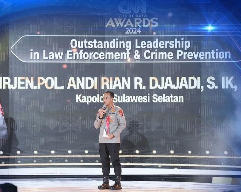 News Lintas Sulawesi/Polda Sulsel; Kapolda Sulawesi Selatan Irjen Pol Andi Rian R Djajadi, S.I.K., M.H didampingi Pejabat Utama Polda Sulsel Terima penghargaan dari CNN Indonesia Awards 2024, bertempat di Hotel Claro Jl. A.P. Pettarani Makassar, Kamis (21/03/24)