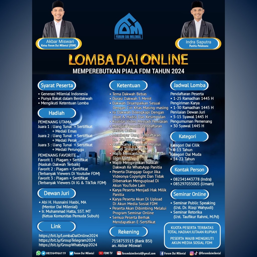 Ketua Umum FDM atau sering di sapa Kanda Akbar mengajak kepada seluruh Milenial Indonesia supaya menggunakan kesempatan emas ini, untuk menjadi peserta Lomba Dai Online Tahun 2024.
