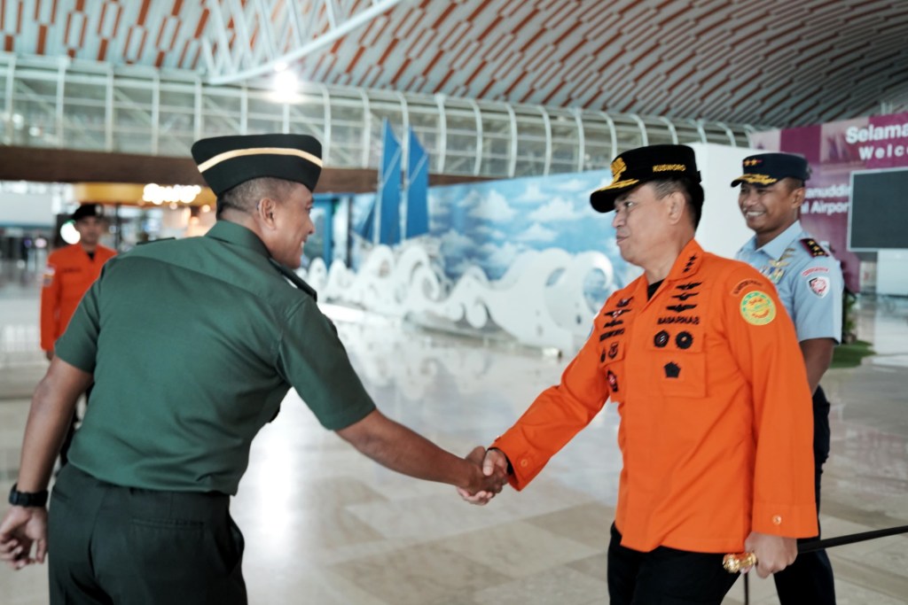 News Lintas Sulawesi/Maros; Inspektur Kodam (Irdam) XIV/Hasanuddin Brigjen TNI Dwi Endrosasongko, S.Sos., M.I.P., mewakili Pangdam, mengantar keberangkatan Kepala Badan Nasional Pencarian dan Pertolongan (BNPP/BASARNAS) RI, Marsekal Madya TNI Kusworo, S.E., M.M., bertempat di Bandara Internasional Sultan Hasanuddin, Kab. Maros. Rabu, (27/03/2024).