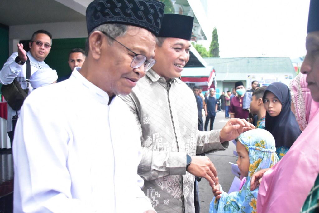 Usai melakanakan shalat, Danrem bersama gubernur dan unsur Forkopimda memberikan santunan kepada anak yatim dan warga difabel dilanjutkan dengan Halal Bihalal makan bersama Masyarakat. (Penrem_132).