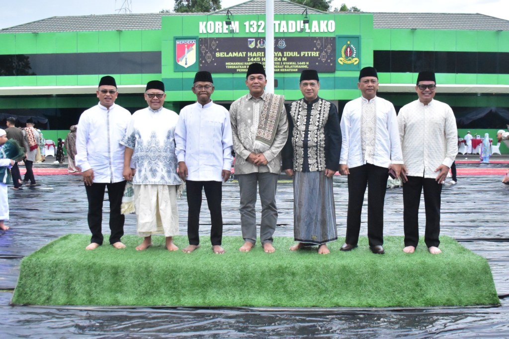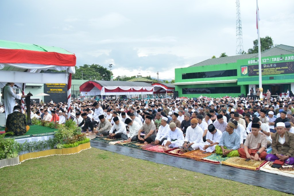 Shalat Idul Fitri di Markas Korem 132/Tdl ini dipimpin oleh imam Ustadz Arifdal Abdul Muis, S.Pdi Sementara yang bertindak sebagai khatib adalah Dr. H. Ali Imron Sulthan, S.SY., M.H.I.