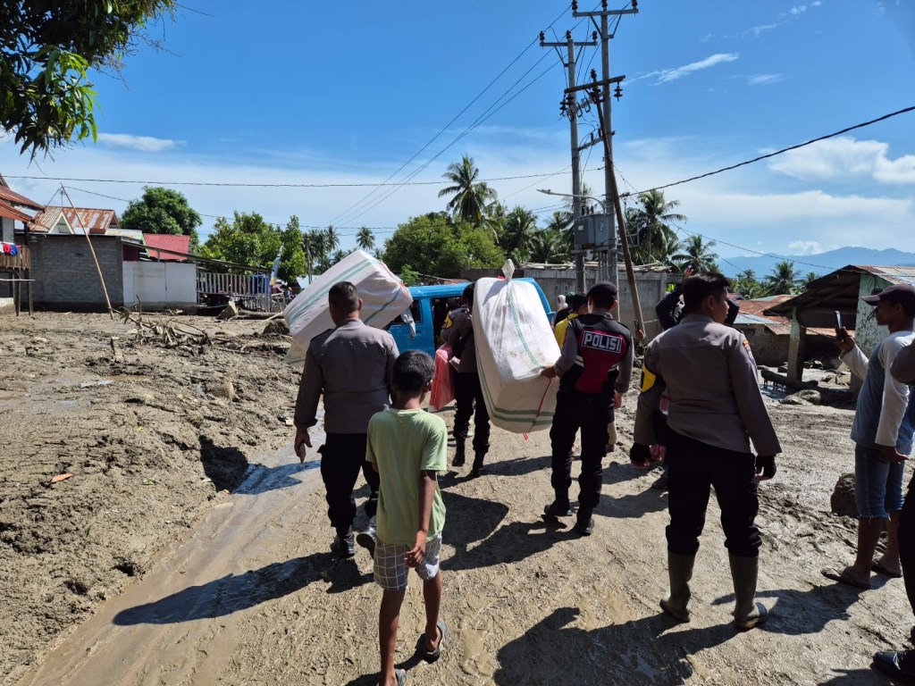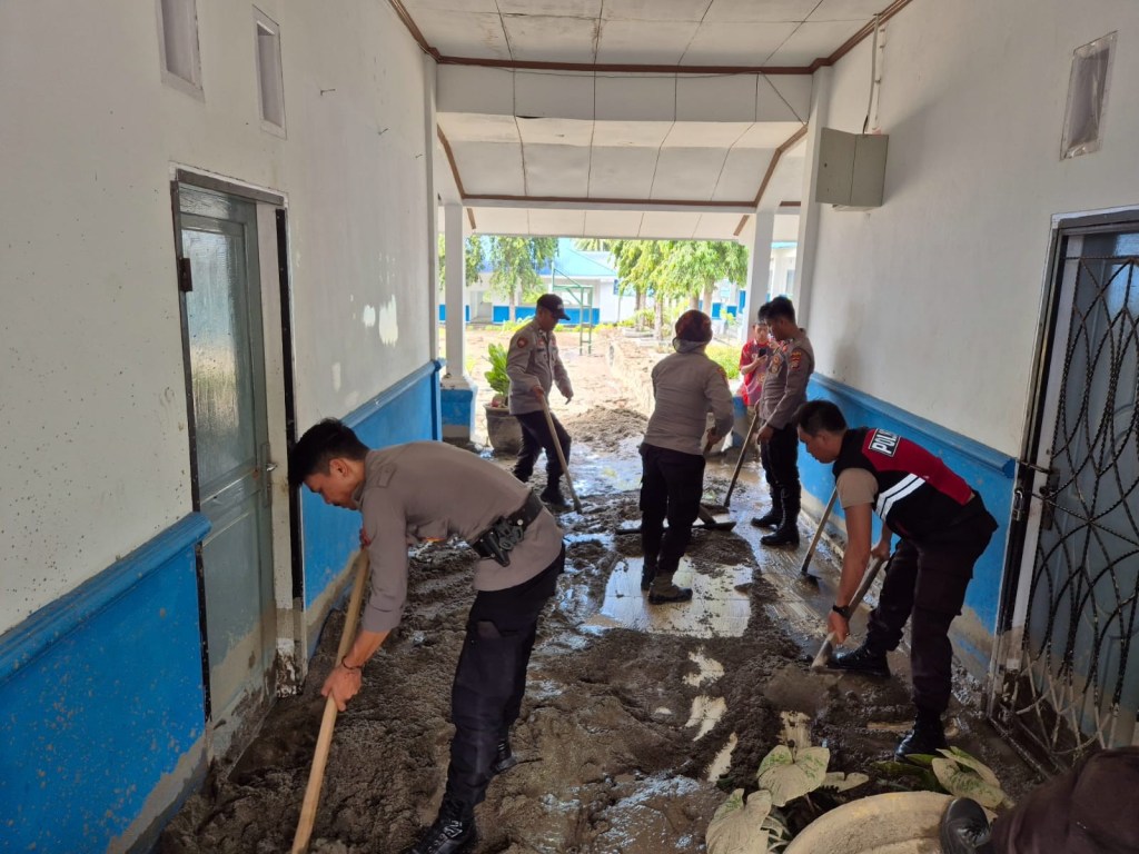 Personel Polres Sigi dan Polsek Dolo terjun langsung ke rumah warga, sekolah dan tempat ibadah untuk melakukan pembersihan material banjir berupa lumpur, batu, dan sampah yang terseret arus banjir akibat meluapnya Sungai Ombi karena tingginya intensitas curah hujan beberapa hari belakangan ini.