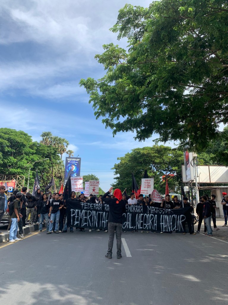 Terlihat kain hitam bertuliskan pemerintah gagal, negara hancur dibentangkan oleh massa aksi dari FREDOM mengarah ke jalan A.P.Pettarani makassar