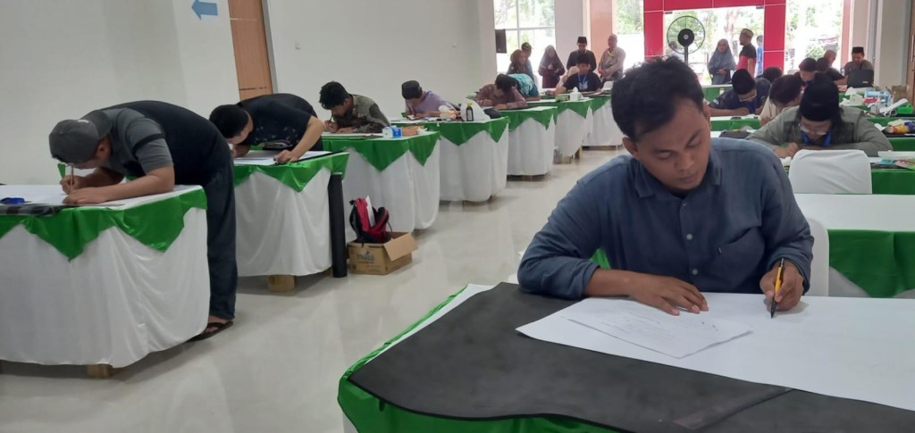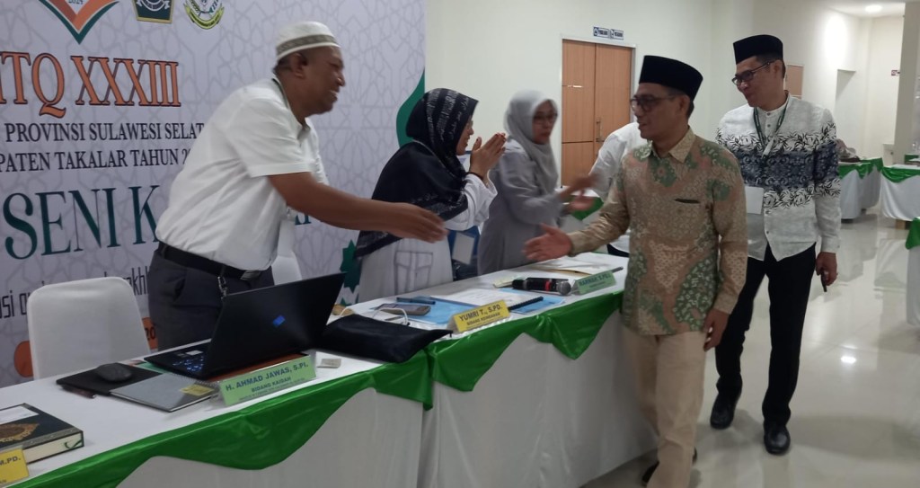 News Lintas Sulawesi/Takalar; Hari pertama MTQ Tingkat Provinsi Sulsel XXXIII, di Kabupaten Takalar, Kakanwil Kemenag Sulsel, H. Muh. Tonang mengunjungi lomba cabang kaligrafi (khat) Al Qur’an, di aula Perpustakaan dan Kearsipan Takalar, Jumat, 3 Mei 2024.
