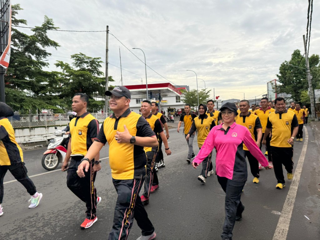 News Lintas Sulawesi/Sungguminasa; Kapolres Gowa AKBP R.T.S Simanjuntak, S.H., S.I.K., M.M., M.I.K. bersama Ketua Bhayangkari Cabang Gowa, Ny. Lidya Reonald melaksanakan olahraga pagi bersama yang diikuti oleh Bhayangkari, PJU, personel, dan ASN Polres Gowa, Jum’at (03/05/2025).