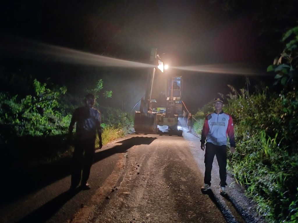 News Lintas Sulawesi/SIGI: Kapolsek Kulawi bersama personel polsek bergerak cepat melakukan tindakan kepolisian berupa pengaturan arus lalu lintas (lalin) di lokasi pembersihan material tanah longsor dan pohon tumbang yang menutupi jalan poros di Desa Sungku, Kecamatan Kulawi, Sigi. Kamis (09/05/2024) malam.