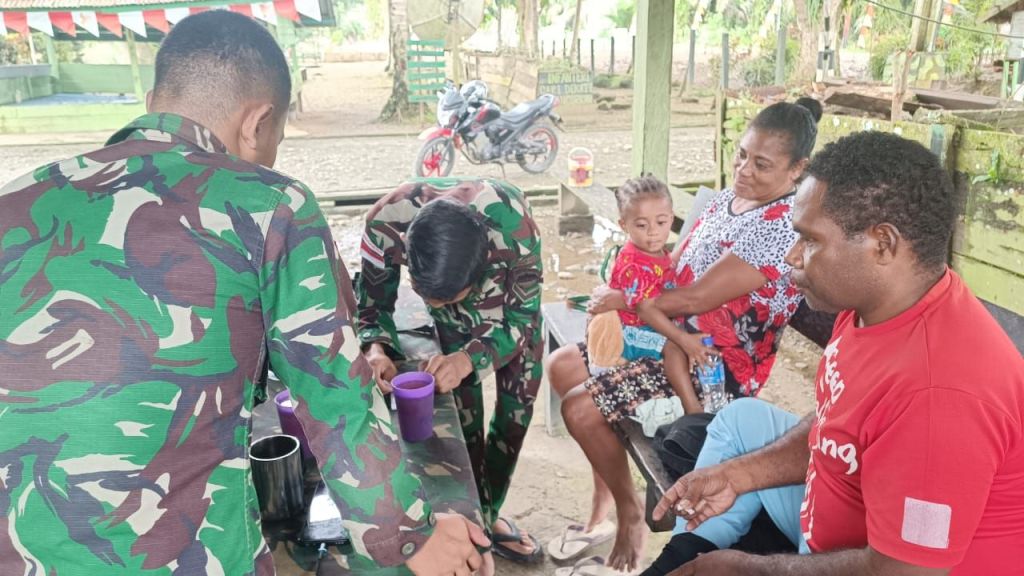 Salah satu warga Kampung Amyu Bapak Kain Ronsumbre datang ke Pos Pitewi untuk berobat ke pos, dengan sigap personel kesehatan pos Serda Yan Fathur Rahman selaku Bakes pos Petewi Langsung memberikan pelayanan kesehatan kepada Bapak Kain Ronsumbre yang sedang mengalami sakit.