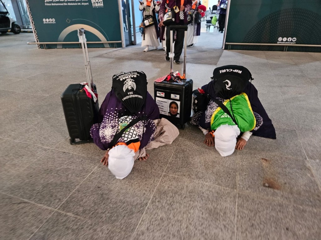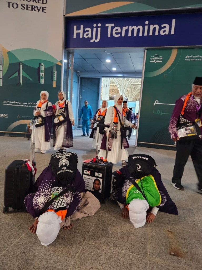 Jemaah yang didominasi warga asal Kota Makassar keluar melalui Terminal Internasional khusus Haji, Tampak wajah-wajah haru dan bahagia dari para jemaah saat pertama kali menginjakan kaki di Tanah Suci. Beberapa terlihat berkaca-kaca, bahkan tidak sedikit diantaranya yang sujud syukur